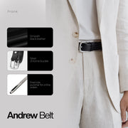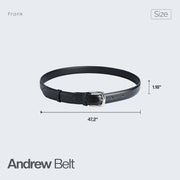 Notable for its sleek, modern construction, the Andrew belt is made from smooth black leather. Elegant and understated, this belt can be paired with both smart and relaxed ensembles.