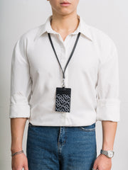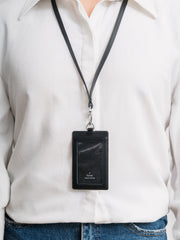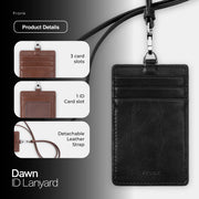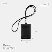 The DAWN ID Lanyard is crafted from premium genuine leather, featuring a front panel with three card slots and a minimalist back with a clear window for an ID photo.